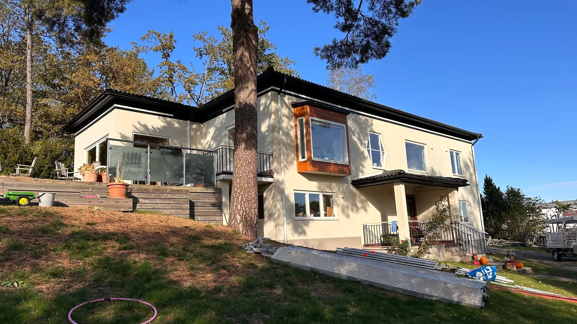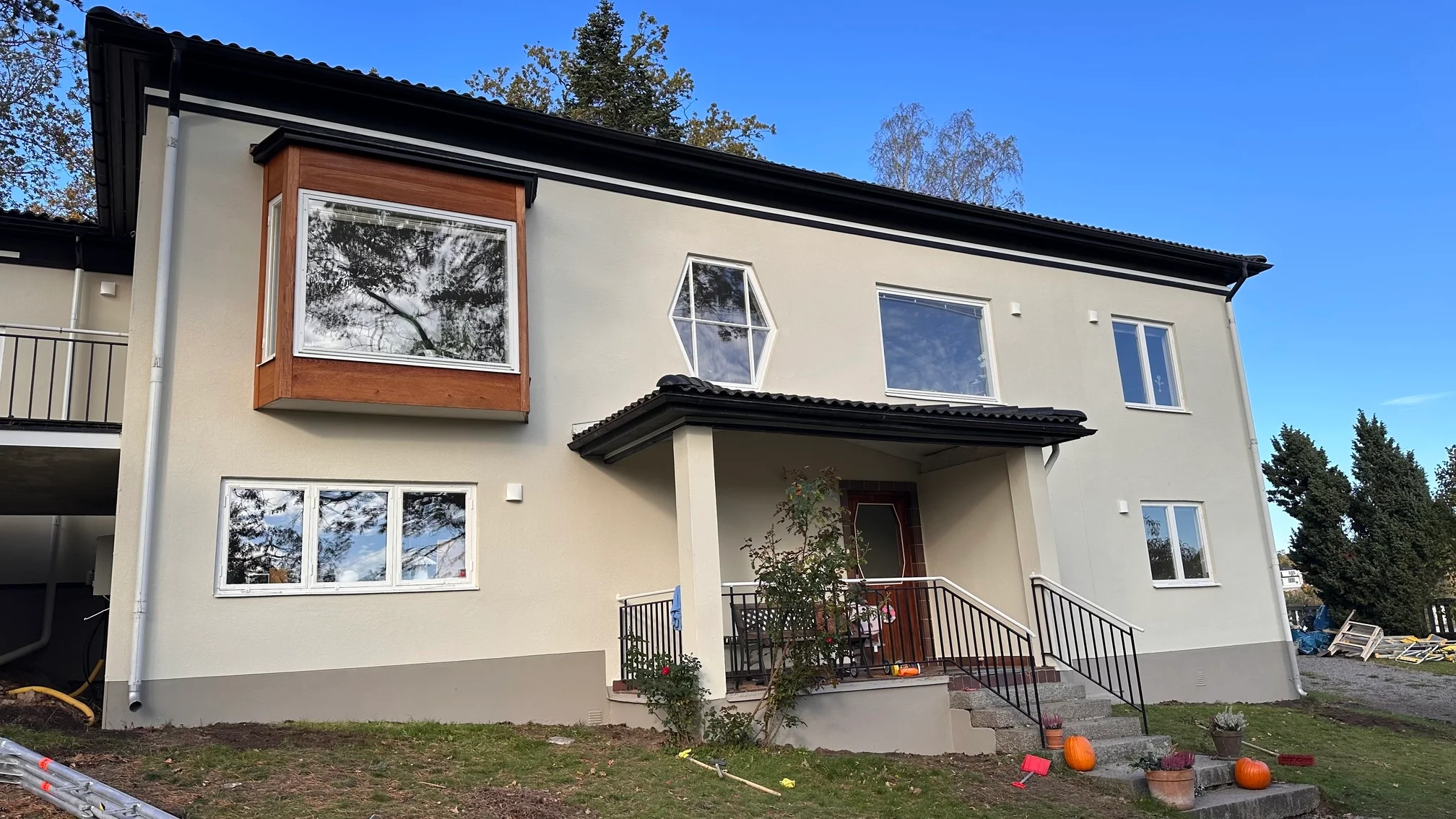 Omfattning: Renovering fasad och sockel. Montage av insektsnät och byte av takfotsbrädor.